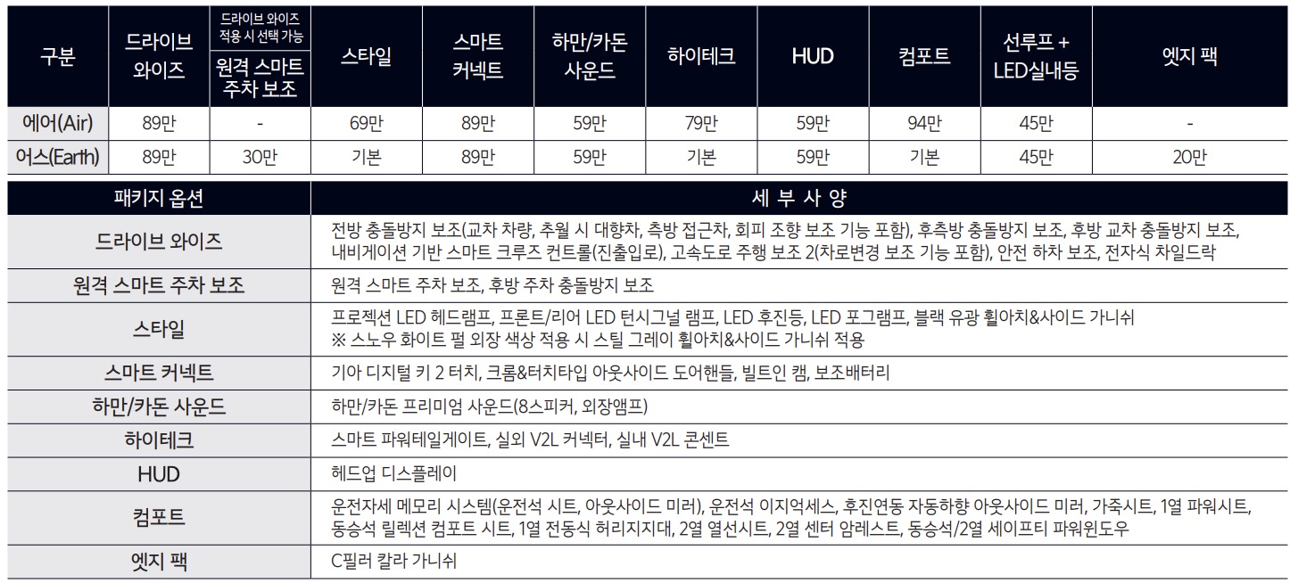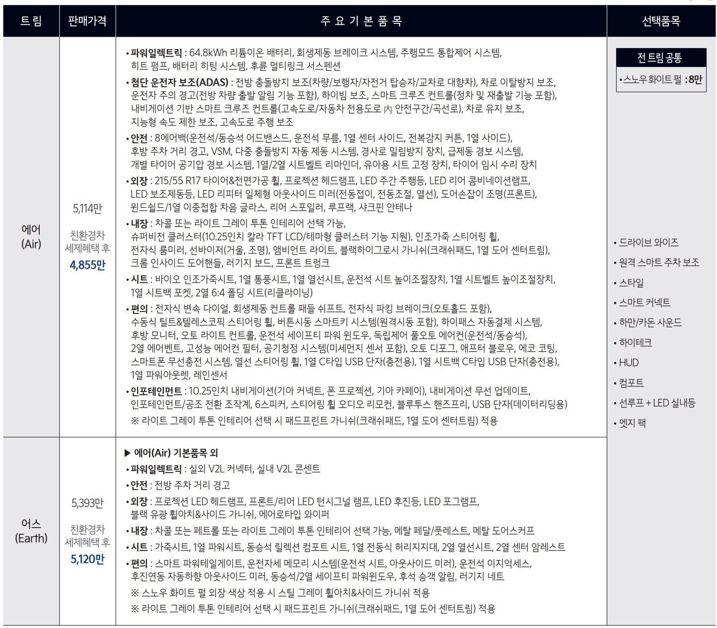 완충 시 통합 주행거리는 일반 배터리 385km다. 슬림 패키지는 246km다. 가격은 4780만 원에서 4980만 원까지 다양합니다. 풀옵션 가격은 코나와 비슷한 5500만 원 선입니다. 화살표 무늬로 디자인해 기존보다 더 낫다는 평가가 많습니다. 하지만 라디에이터 부분은 코나 EV, 쏘울 EV, 레이 EV와 함께 공유하는 단점으로 충전구 커버로 제작돼 눈에 띄기 때문에 거슬린다는 의견이 많습니다.