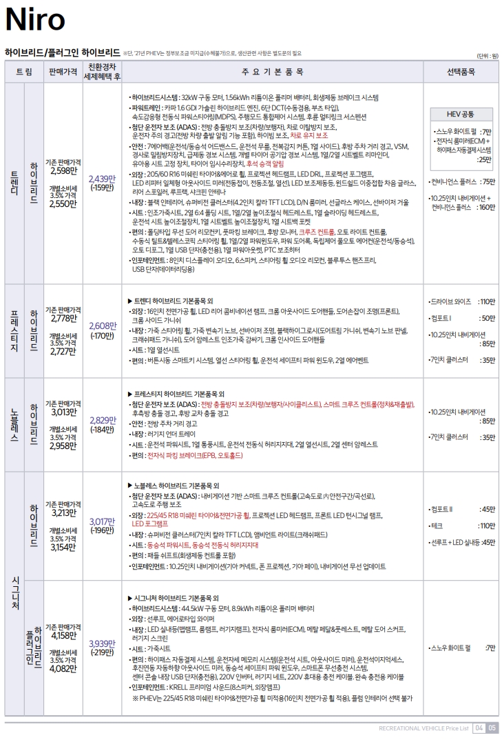 니로 플러그인 하이브리드 자동차 가격표 정리