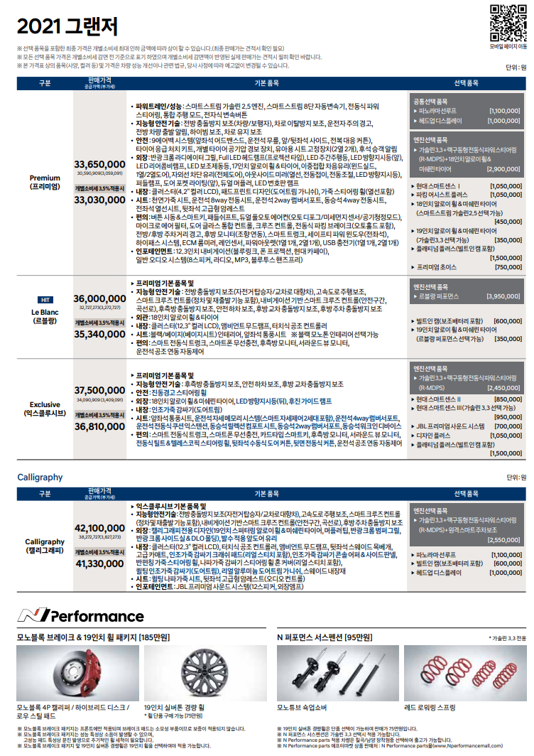 하이브리드 모델은 페이스리프트 이전과 달리 레터링이 따로 되지 않습니다. 그러니까 외관상 차이는 휠밖에 안 나요 이는 그랜저의 주요 수요층이 하이브리드 모델이라고 해서 차별화된 외관을 원하지 않는 고객이 많다는 점을 반영한 것이라고 합니다. 사전 계약 당시 40대의 비중이 높았던 것과 달리 출시 3개월 정도 지난 그랜저의 실제 성적표를 보면 여전히 50대 이상 중년층이 가장 많이 구매하고 있음을 알 수 있습니다. 2020년 7월에 모노 블록 브레이크, 19인치 경량 휠, 모노 튜브 서스펜션 및 삭업 쇼버의 N 퍼포먼스 부품 옵션이 추가되었습니다. 브레이크는 경량 휠과 패키지만 판매하며, 경량 휠과 서스펜션은 각각 단품 선택도 할 수 있습니다.