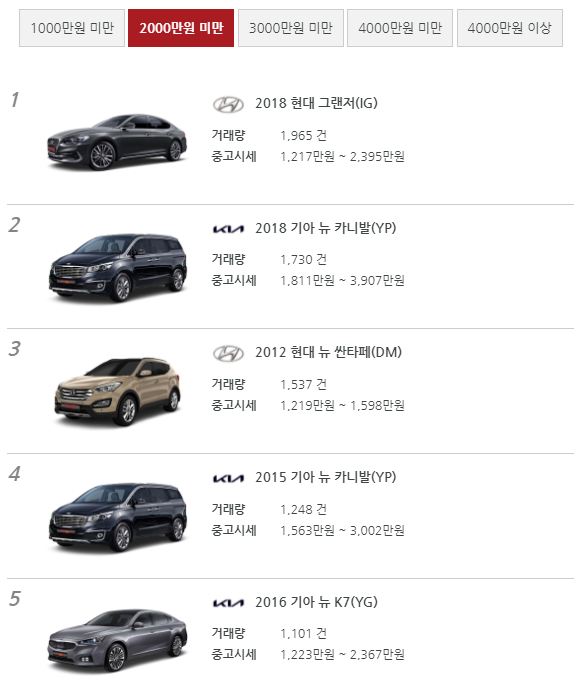 2000만원 미만 중고차 1위부터 5위 순위는 현대그랜저 카니발 싼타페 k7 등이 있습니다,