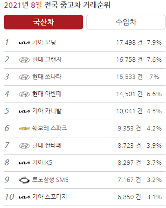 국산차 중고차 거래 순위는 기아모닝,그랜저,쏘나타,아반떼,카니발,스파크,싼타페,k5,sm5,스포티지 순입니다.