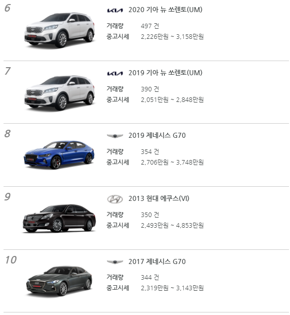 3000만원 미만 중고차 시세 6위부터 10위는 기아쏘렌토 g70 에쿠스 등이 있습니다.