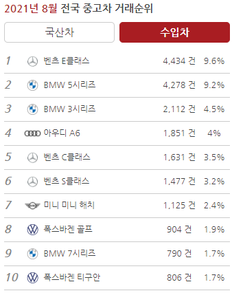 수입차 중고차 거래 순위는 벤츠 e클래스, bmw 5시리즈, bmw 3시리즈, 아우디 a6, 벤츠 c클래스, 벤츠 s클래스 폭스바겐골프 순입니다.