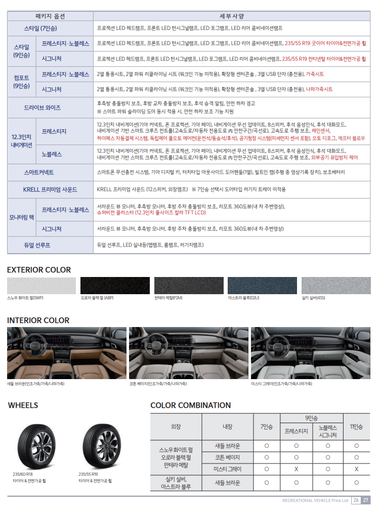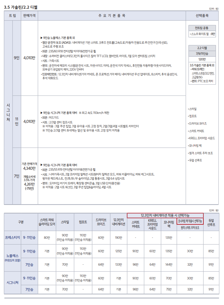 우선 7, 9, 11인승으로 하이브리드, 4WD 여부에 대해서는 출시 계획이 없다고 잘라 말했습니다. 4WD 미니밴이 많이 팔리지 않을 뿐더러요.그리고 단가 문제, 싱글시트를 포기해야 하는 문제 등으로 출시가 불가능합니다. 이전 세대와 달리 유압식 스티어링휠에서 C-MDPS로 교체하며 반자동운전에 필수적인 LKA(차선 이탈방지)를 탑재하여 HDA 지원, LFA(차선유지 보조),FCA(전방충돌방지보조), SCC(스마트 크루즈 컨트롤), LKA, DAW(운전자 주의경고)를 기본 탑재했습니다.