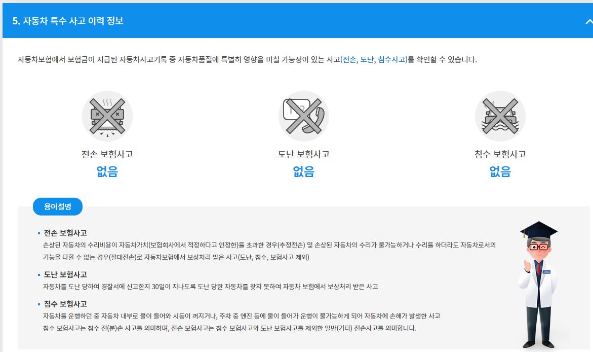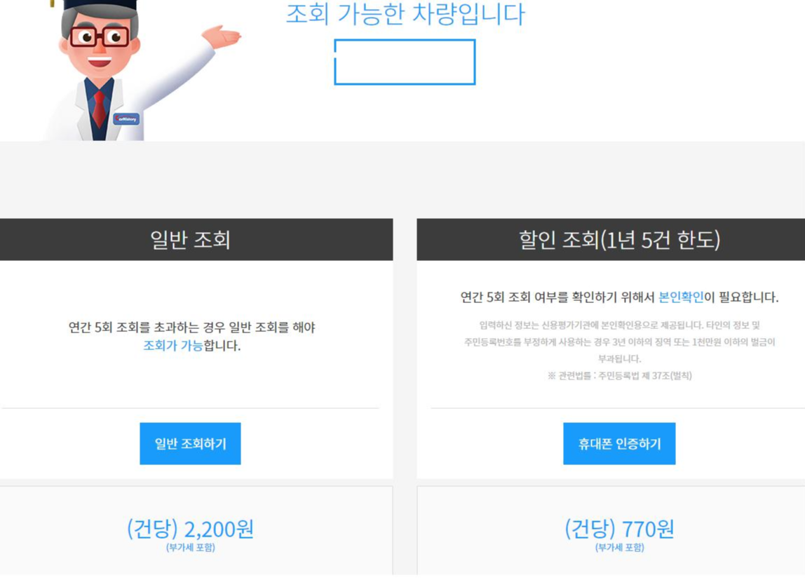 사고이력 조회의 경우 회원가입을 할경우 1건에 770원, 비회원으로 사고이력을 조회할 경우 건당 2200원의 수수료가 발생합니다. 따라서 회원가입을 진행 후 조회하시는것을 추천드립니다.