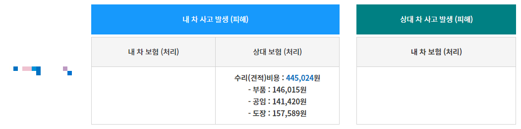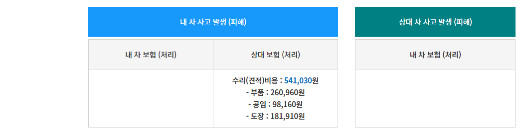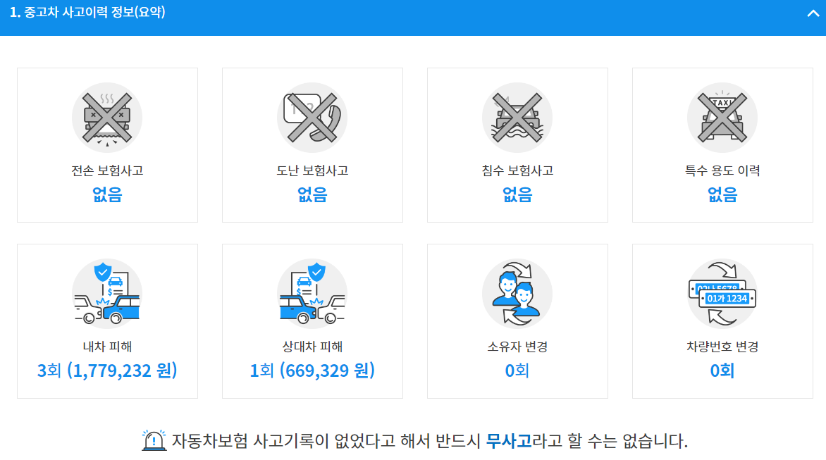 아래로 내리다보면 여태까지 차량의 사고 이력을 확인해볼 수 있습니다. 사고 후 보험처리 금액까지 확인이 가능합니다.