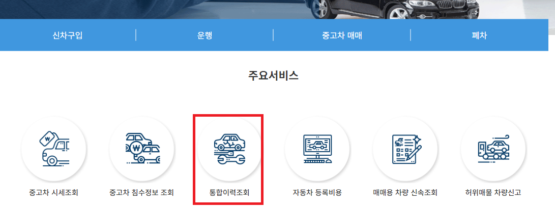 자동차365 홈페이지에서 통합이력조회를 클릭합니다.