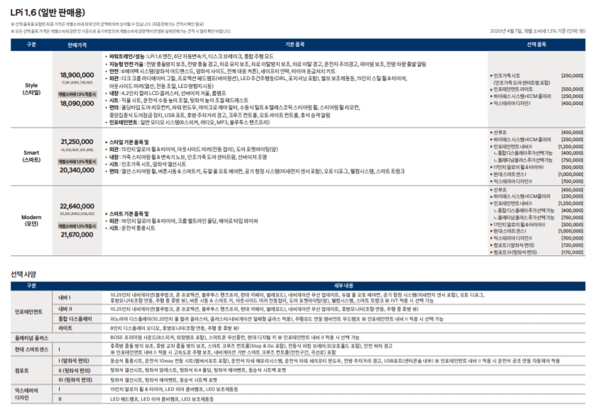 스마트 트렁크와 통합 주행 모드 시스템은 물론, 자동 긴급 제동 시스템, 차선 이탈 경보 시스템, 스마트 후측방 경보 시스템 등 첨단 사양도 적용되었다. 이 외에도, 오주유(혼유사고) 방지 시스템(1.6ℓ U Ⅱ 디젤 엔진에 한함)과 램프 단선 진단 시스템 등 세심함이 느껴지는 편의 사양이 적용되었다. 같은 해 11월 16일에는 앳킨슨 사이클 방식의 누우 149마력 2.0ℓ DOHC 자연흡기 가솔린 엔진과 각종 첨단 능동 안전 기술을 조합한 하이테크 패키지가 추가되었다. 하이테크 패키지는 자동 긴급 제동 보조 시스템, 스마트 크루즈 컨트롤, 차선 이탈 경보 시스템, 스마트 하이빔 등으로 구성되었다. 하지만 2.0 DOHC 앳킨슨 사이클 모델은 인기가 없어서 금방 단산됐다.