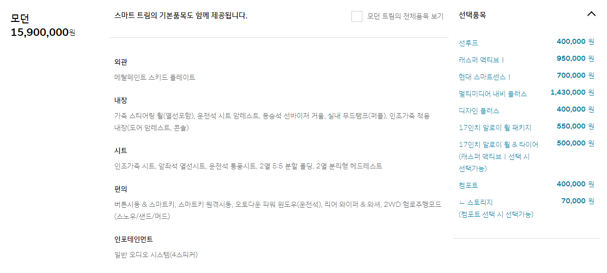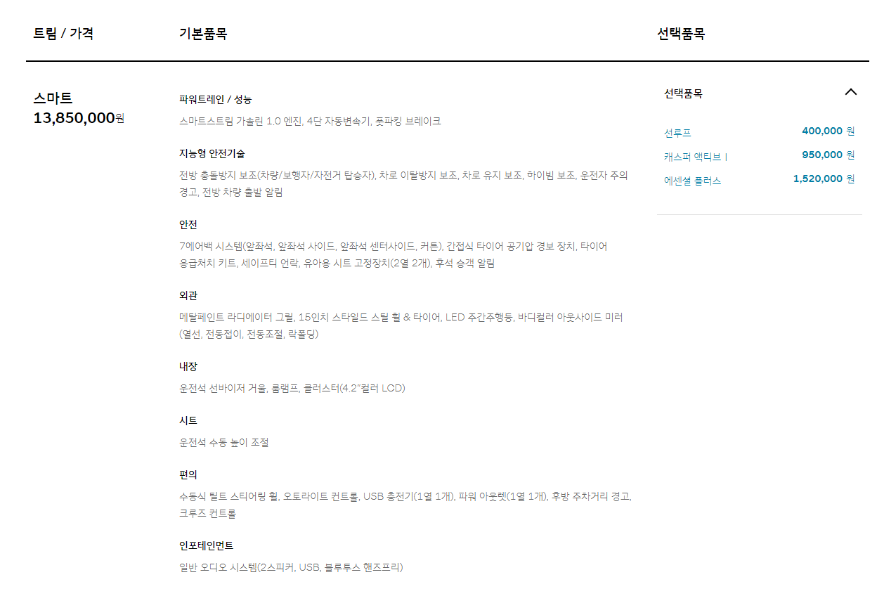 캐스퍼 스마트, 모던, 인스퍼레이션의 가격입니다. 선택품목에서 원하는 옵션을 추가하면 최종 가격이 나옵니다.
