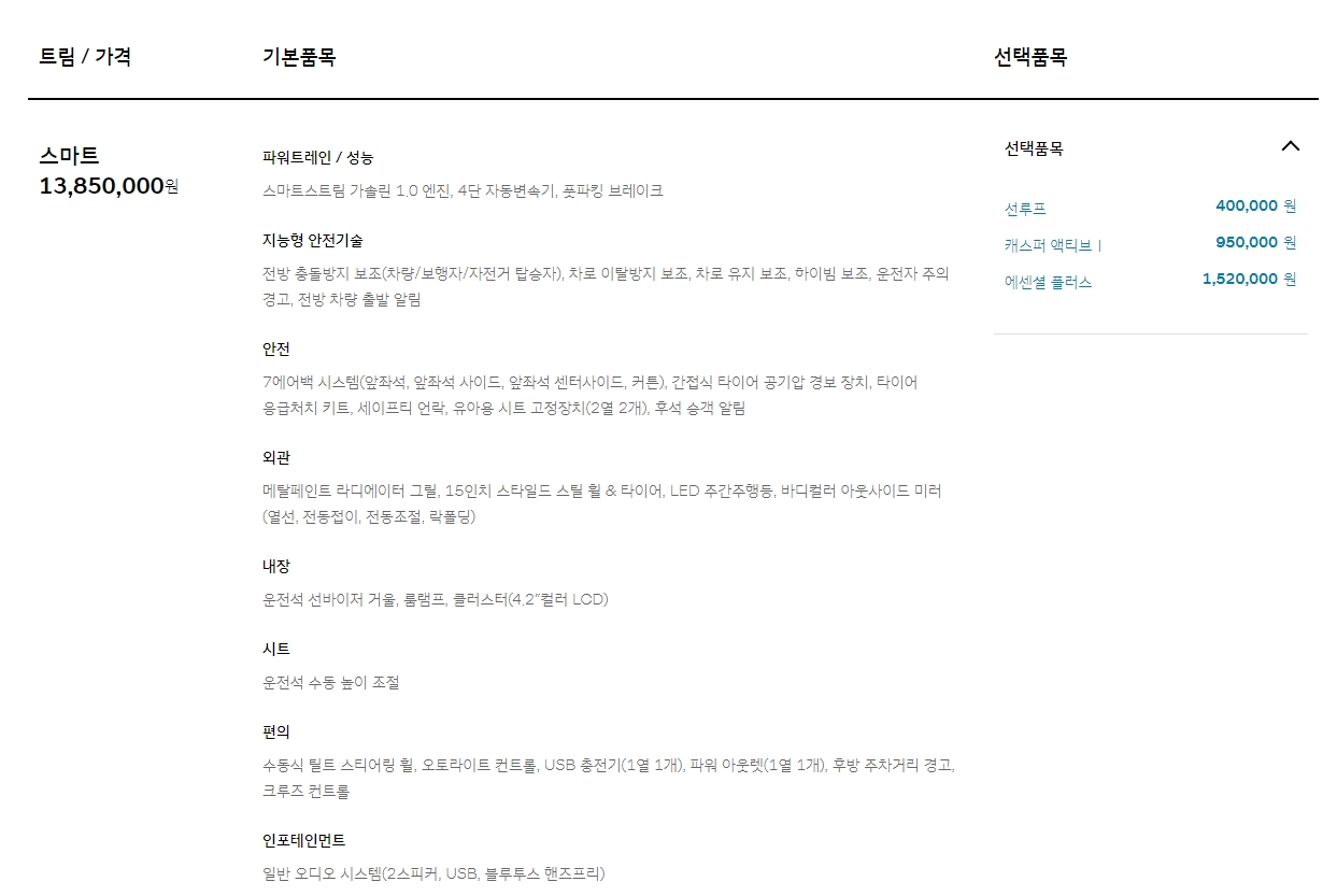 물론 캐스퍼가 들어 있는 것도 아니고, 그저 높기만 한 것이 아니라, 최하 트림에서도 4.2인치 컬러 클러스터, 차선 유지 보조, 오토 하이 빔, 크루즈 컨트롤 등이 기본 사항이기는 합니다. 하지만 1200만원인 최하위인 트림모닝에서도 55만원짜리 드라이브와이즈 I자를 하나 넣으면 차선유지보조와 4.2인치 컬러클러스터가 들어갑니다. 크루즈 컨트롤까지 들어가는 드라이브와이즈II를 포함해도 95만원으로, 합계 1300만원으로 캐스퍼 캔 가격보다 낮고, 게다가 엣지 옵션과 8인치 디스플레이 옵션까지 포함해도 1390만원으로 캐스퍼 캔의 노 옵션 가격과 동일합니다.