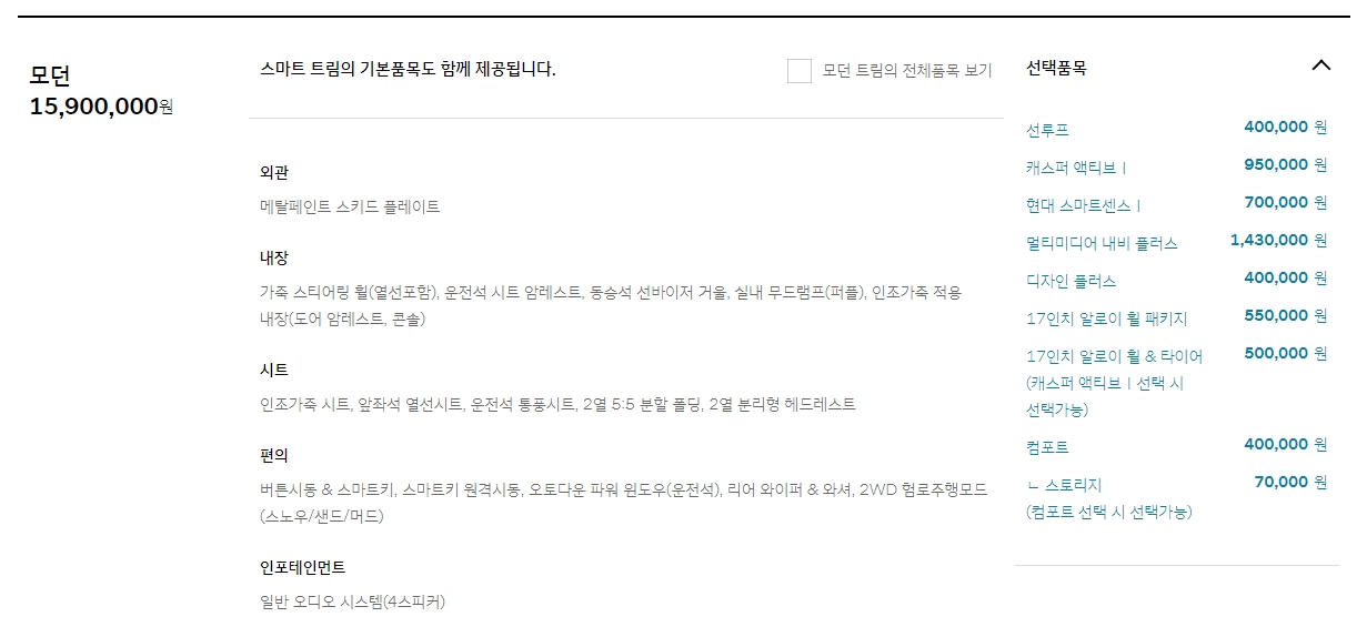 깡통에서 사용할 수 있도록 굽기 위한 최소한의 옵션인 에센셜 플러스 옵션만 포함해도 1,500만원이 넘고 상위 트림인 모던 트림에 오르면 1,600만원에 달하지만 이렇게 되면 아반떼와의 가격 차이는 갈수록 좁혀집니다. 통조림 기준으로 1,385만원 가격에도 리어 와이퍼와 조수석 썬바이저 거울이 없어 스피커가 단 2개에 불과한 비참한 구성일 뿐 아니라 1,600만원짜리 모던 트림에도 스피커는 고작 4개만 달아줍니다.게다가 최저 트림에서는 선호도가 높은 인조 가죽 시트를 처음부터 선택할 수 없습니다.