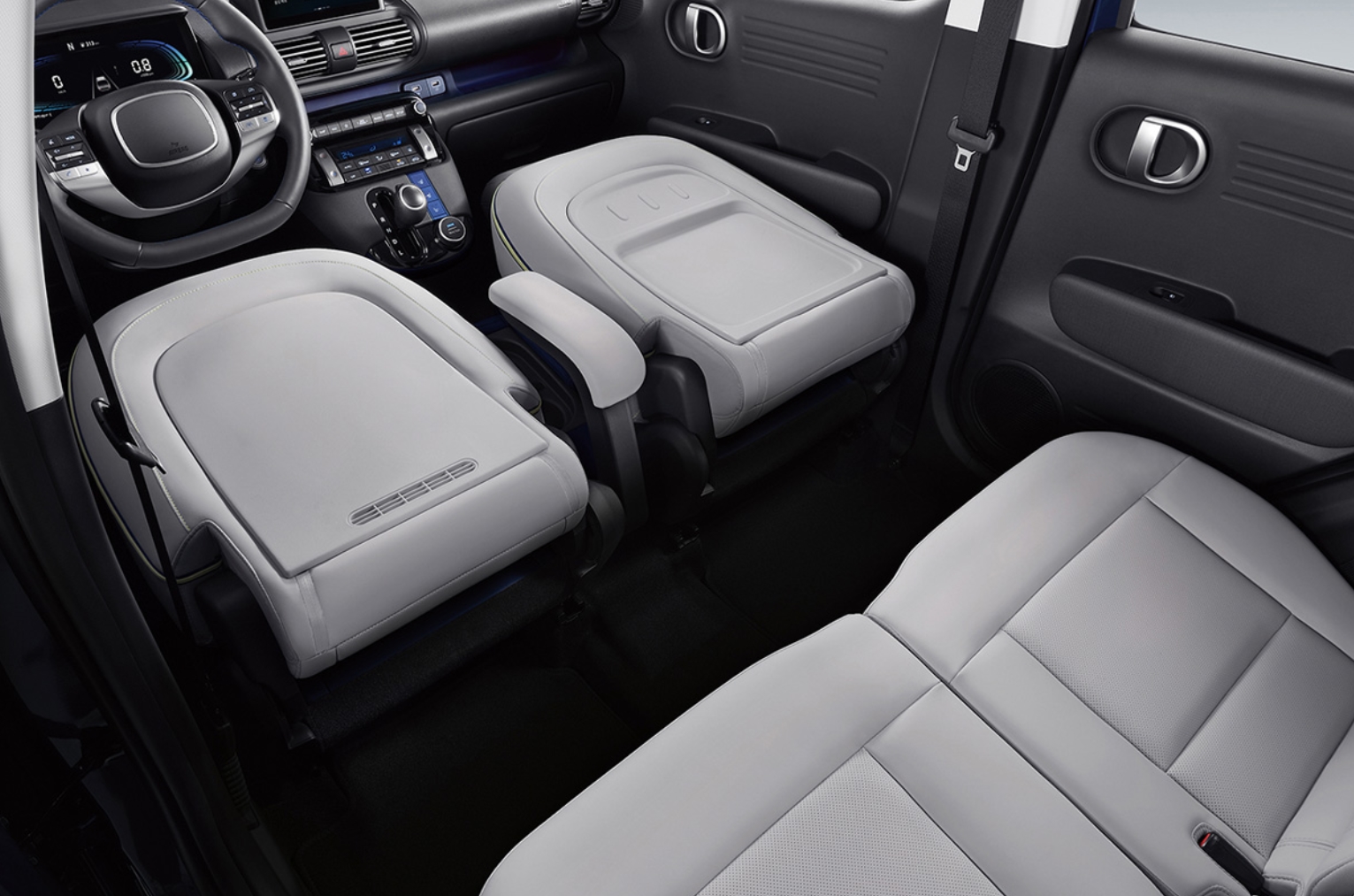 캐스퍼의 인테리어는 부드럽고 편안한 분위기를 연출하며 슬림한 레이아웃으로 인한 개방감과 발랄한 색상의 대조를 느낄 수 있습니다. 그리고 현대 캐스퍼 내부에서는 모든 좌석의 풀폴딩, 리클라이닝, 슬라이딩 기능을 통해 상황에 맞는 공간을 활용할 수 있습니다. 이를 통해 접이식이 가능한 폴딩시트로 유용함을 좀 더 더한 모습을 볼 수 있습니다.