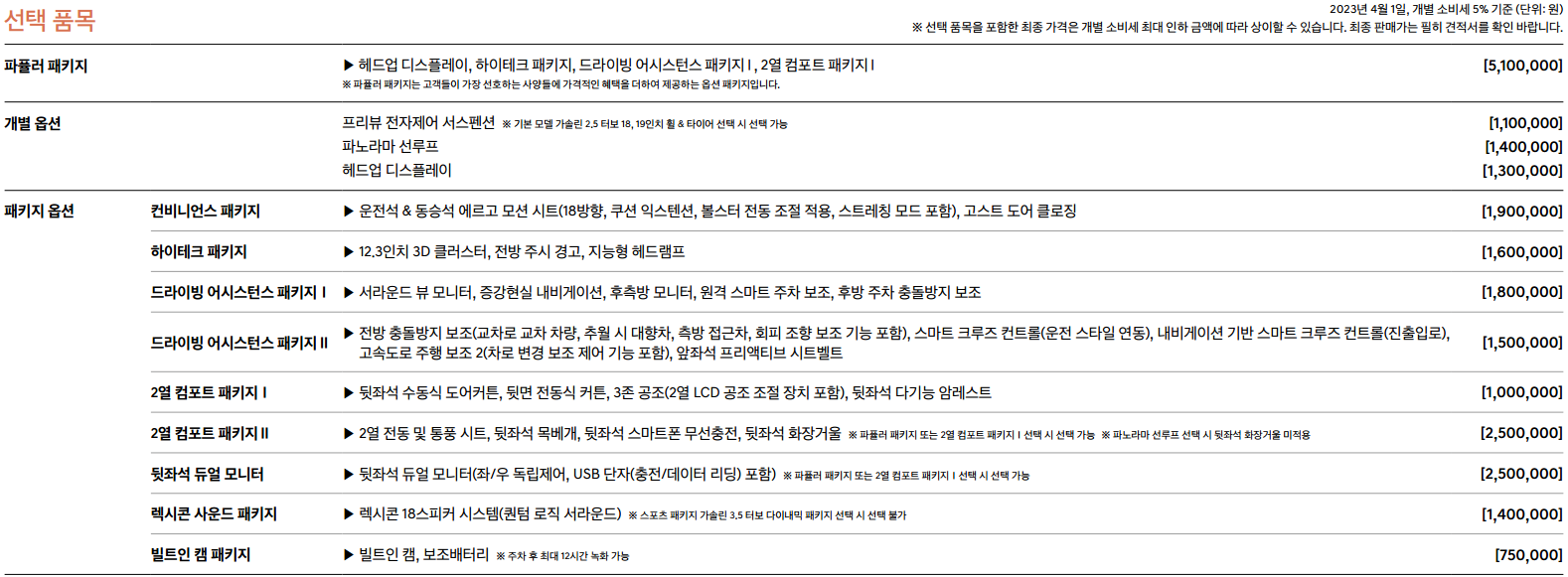 310만원을 추가할 경우 20인치 피렐리 타이어 및 스퍼터링 휠, 전륜 모노블럭 브레이크, 후륜 스타일링 커버가 장착되고, 프리뷰 전자제어 서스펜션 110만원짜리 옵션이 함께 들어갑니다.