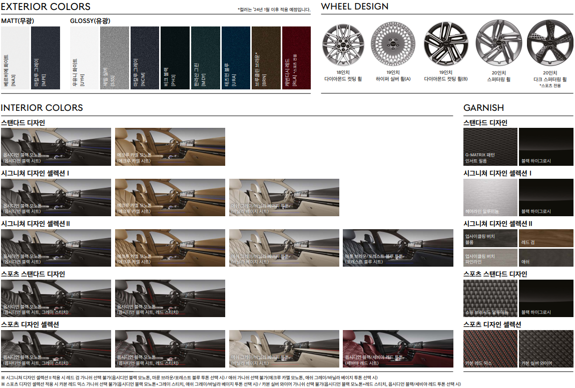 여기에서 시그니처 디자인 셀렉션1 150만원 옵션을 추가할 경우 퀼팅, 파이핑 적용된 천연 가죽 시트로 업그레이드, G-MATRIX 패턴 알루미늄 내장재로 변경, 크래쉬패드, 도어 센터트림가 인조 가죽 내장재로 업그레이드 됩니다.