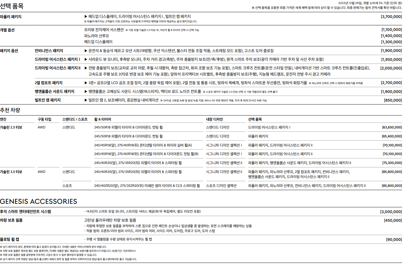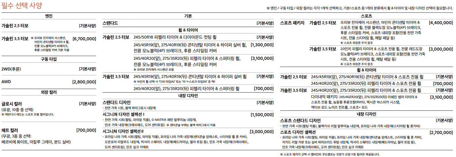 필수선택부터 살펴보자면 기본 가솔린 2.5 터보 엔진에서 3.5 터보로 업그레이드 할 경우 670만원이 추가됩니다. 포스팅에서는 기본 가솔린 2.5 모델로 설명하도록 하겠습니다.