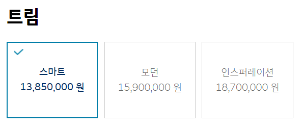 현대 캐스퍼 자동차 가격은 트림에 따라 다릅니다. 스마트 트림은 1385만원부터 시작, 모던트림은 1590만원부터 시작 인스퍼레이션 트림은 1870만원입니다.