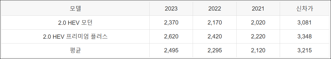 | 2.0 HEV 모던 | 2,370 | 2,170 | 2,020 | 3,081 |