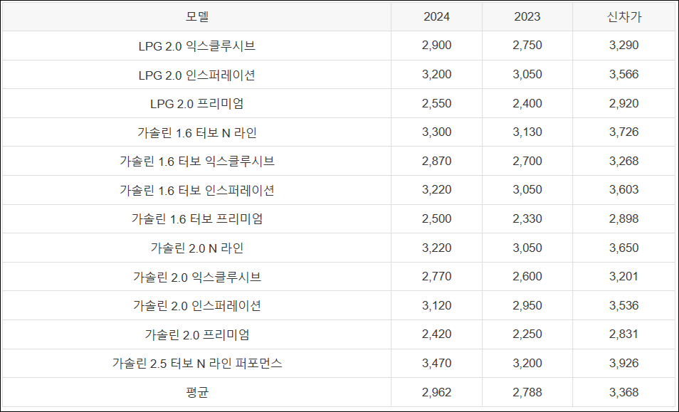 | 모델 | 2024 | 2023 | 신차가 |
