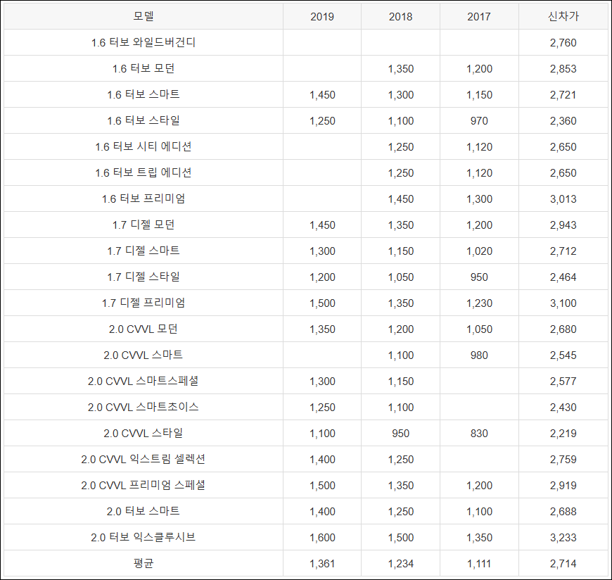 | 1.7 디젤 모던 | 1,450 | 1,350 | 1,200 | 2,943 |