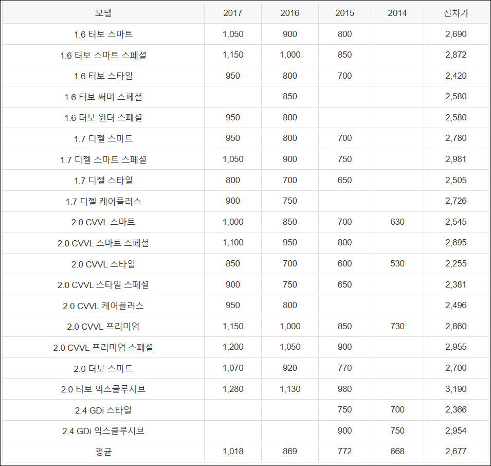 | 모델 | 2017 | 2016 | 2015 | 2014 | 신차가 |