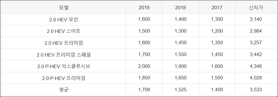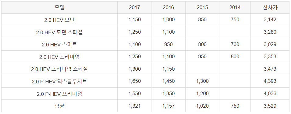 | 2.0 HEV 프리미엄 | 1,250 | 1,100 | 950 | 800 | 3,353 |