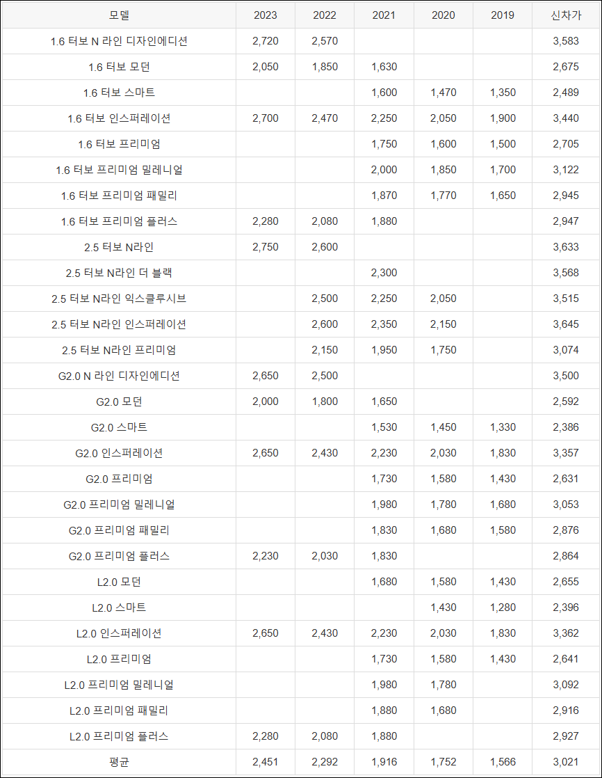 | 모델 | 2023 | 2022 | 2021 | 2020 | 2019 | 신차가 |