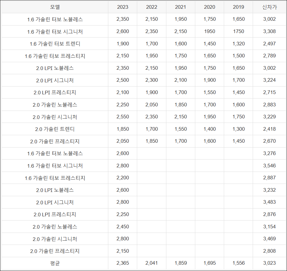 | 2.0 LPI 노블레스 | 2,350 | 2,150 | 1,950 | 1,750 | 1,650 | 3,002 |