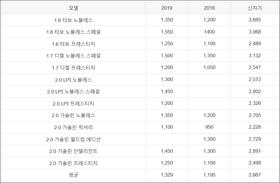 | 1.6 가솔린 터보 노블레스 | 2,350 | 2,150 | 1,950 | 1,750 | 1,650 | 3,002 |