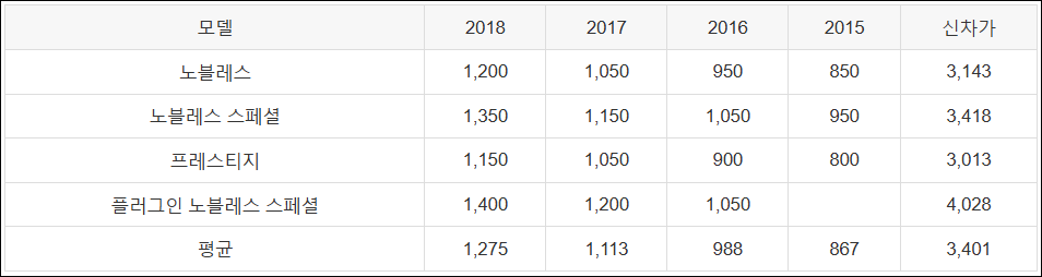 | 모델 | 2018 | 2017 | 2016 | 2015 | 신차가 |