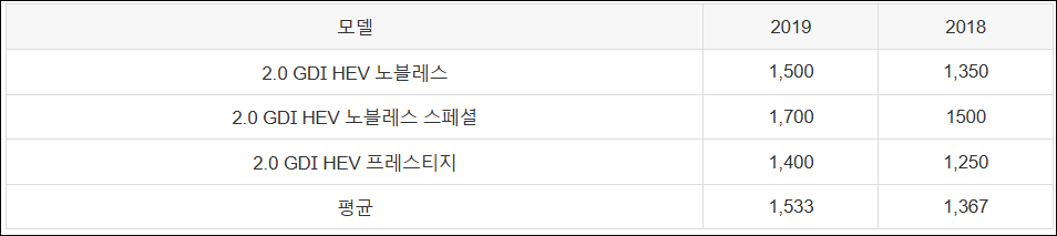 | 2.0 HEV 노블레스 | 2,550 | 2,350 | 2,150 | 2,000 | 1,850 | 3,430 | ||