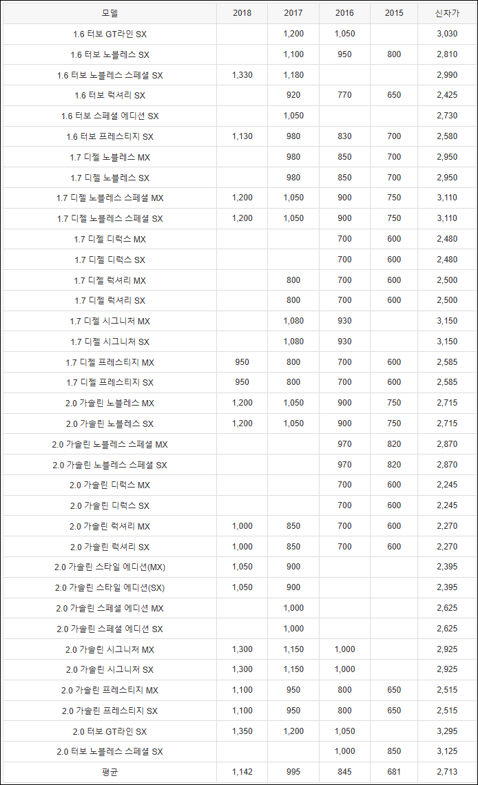 | 1.7 디젤 프레스티지 SX | 950 | 800 | 700 | 600 | 2,585 |