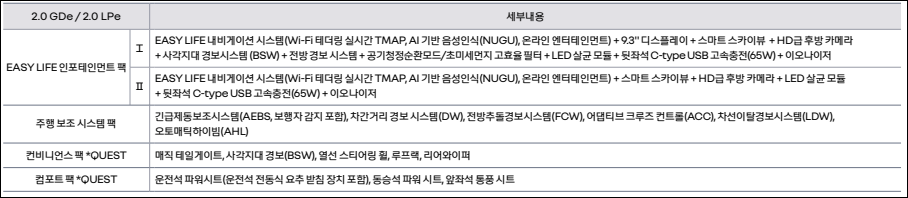 성능면에서 QM6 GDe는 2.0리터 자연흡기 가솔린 엔진이 돋보이며, 12km/리터, 144마력, 20.4kg.m 토크로 동급 최고의 연비를 자랑합니다. 국내 유일의 LPG 연료 SUV로 독보적인 LPe 버전은 1회 충전으로 최대 534km를 주행할 수 있어 장거리 주행에 효율적인 선택이 됩니다.