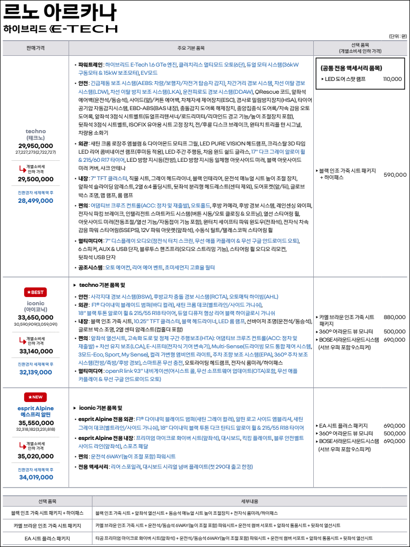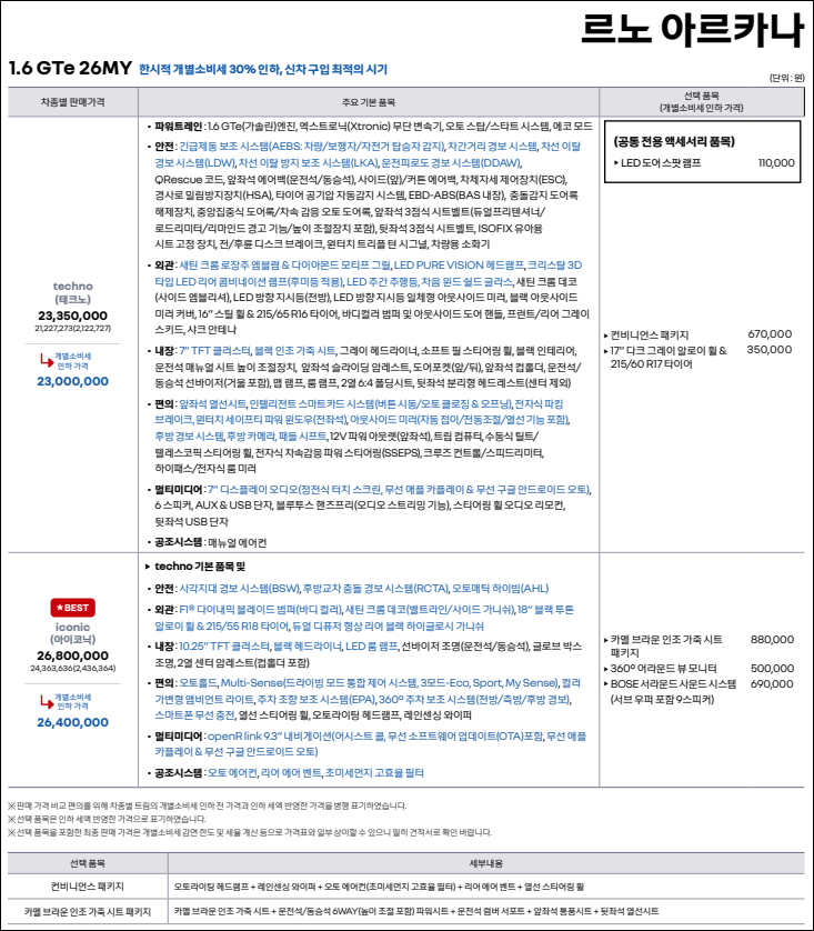 결국, 대부분의 개인 운전자들은 2,293만원의 RE 등급 모델을 선택할 것으로 예상된다. 여기에 이지커넥트 내비게이션 등 163만원대 시그니처 패키지II와 앞좌석 환기시트 등 106만원대 검은색 가죽 시트 패키지II는 물론 별도다. 풀옵션으로 구입해도 3000만 원이 채 안 된다. 그러나 자율 주행과 관련된 옵션은 경쟁 모델에 비해 상대적으로 약하다. 이제 전체 옵션에 대해 공통 차선 유지 보수 지원 기능이 전혀 채택되지 않았으며, 앞서 언급한 바와 같이 4륜 구동기능은 포함될 수 없다. 지난해 SM5와 같은 옵션을 단순화해 개발비와 생산애로 측면에서 우위를 확보했다. 볼 수 있어요. 르노삼성은 모든 모델을 1개 공장과 1개 생산라인과 혼합해 생산하는 구조여서 옵션 간소화가 필수다. 결론적으로, 그것은 분명 인터넷에서 흔히 거론되는 '혜택 가격'의 수준은 아니다. 1.6L N/ASE~LE 트림은 같은 사이즈보다 저렴하지만 28L 옵션을 올리면 경쟁 차종인 쉐보레 트레일블레이저(29L)나 기아 셀토스와 큰 차이가 없다.