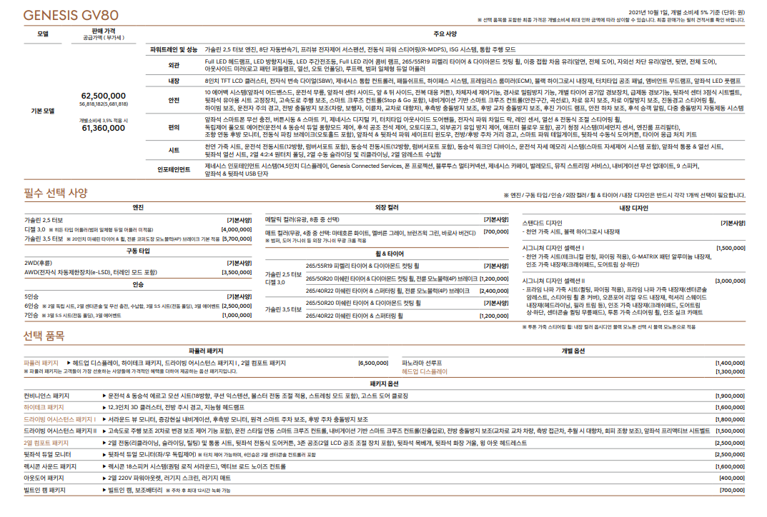 그리고 기존에는 6천만원 정도의 G380 프레스티지 이상만 기본으로 장착되었으며 하위트림에게는 추가도 불가능했던 후방 경보시스템이 하위트림에게도 추가 옵션으로 선택할 수 있도록 변경되었습니다. 차체 및 일반 부품의 경우 기존 3년 6만km에서 5년 10만km로 보증을 강화했습니다. 가격은 기존 2세대 제네시스 중 선택지를 통해 돈을 내고 추가해야 했던 옵션들이 기본 품목으로 들어가면서 다른 새로운 옵션들이 들어가면서 기존 2세대 제네시스 DH보다 소폭 상승했지만 대략 4,899~7,343만원으로 책정되었습니다. 기존 제네시스 DH 대비 다수의 옵션이 추가되어 가격이 다소 상승했습니다. 부분변경 모델이며 가격대가 높은 고급세단임에도 불구하고 일주일만에 사전계약 5,120대의 계약을 받아 준수실적을 남겼으며, 이후 출시 직전까지 11,200명의 고객에게 사전계약을 신청받았습니다. 그 후의 V63, 300cc 가솔린 트윈 터보 모델, G80 스포츠의 가격대는 6,900~7,200만원으로 출시되었습니다. 판매량 중 대다수를 차지하는 모델은 4,900만원대~6,200만원 V63300cc GDI 모델입니다.