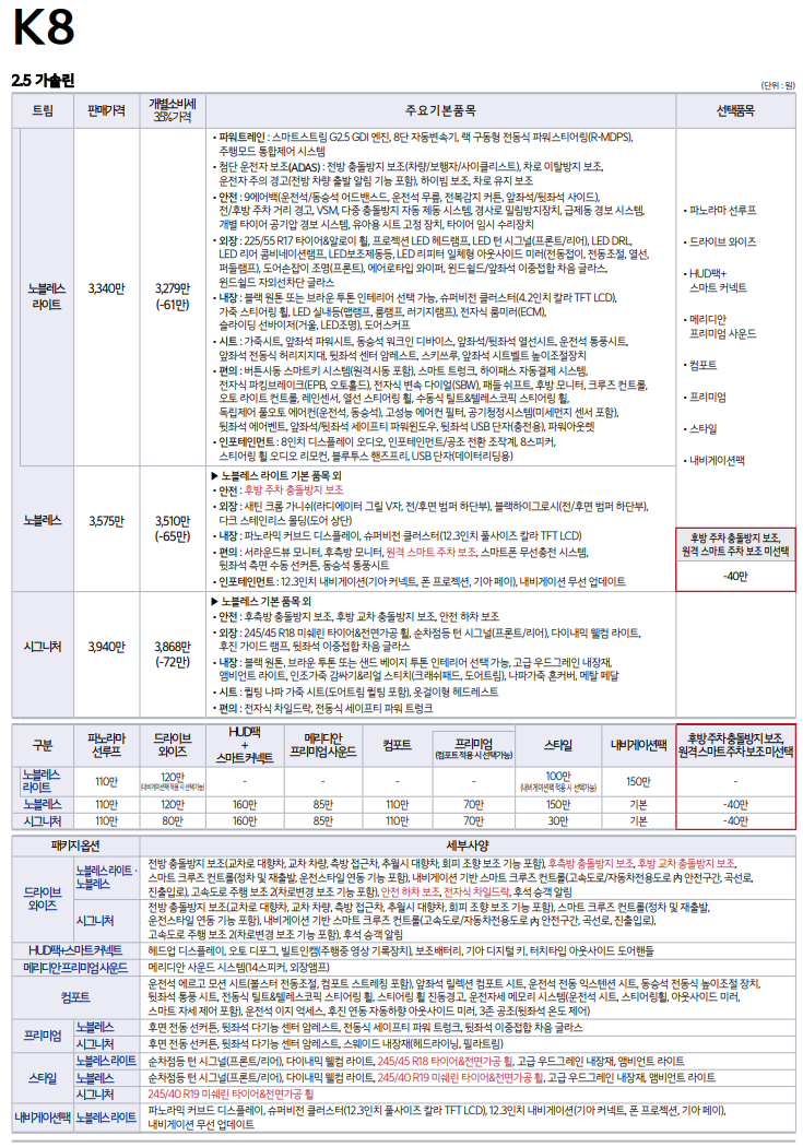 특히 2.5L 모델의 시판가격은 더 뉴 그랜저보다 15만원 저렴하고, 4WD를 감안하면 풀옵션이 K7에 비해 소폭 올랐음을 알 수 있습니다. 하지만, 만약 여러분이 꼭대기 트림인 시그니처로 올라가면 그것은 더 뉴 그랜저 캘리그래피 트림보다 1,200만원 더 비쌉니다. 하이브리드 모델의 경우, 새로운 파워트레인이 적용되었기 때문에 K8은 상단 트림 풀 옵션을 기준으로 뉴 그랜저 하이브리드보다 300만원 가까이 비쌉니다.