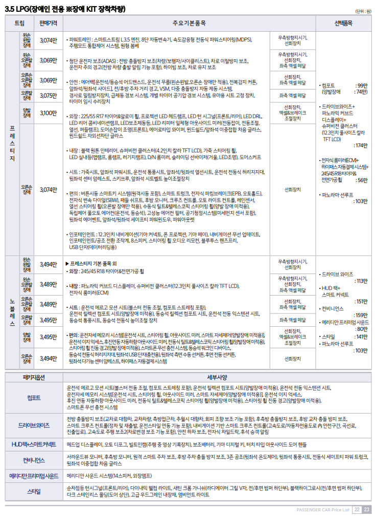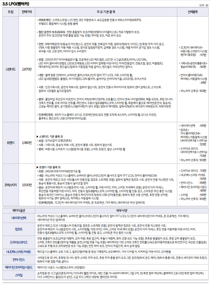 한편, 일부 언론 기사들은 전자 4WD 모델의 출시를 언급했습니다. 환경부 인증 결과 4WD 모델이 없어 실제 출시될지 의문이었으나 3월 9일 3.5L 가솔린 AWD 인증이 뒤늦게 확인됐습니다. AWD는 3.5L 가솔린에만 선택적으로 장착할 수 있는 것으로 확인되었습니다.