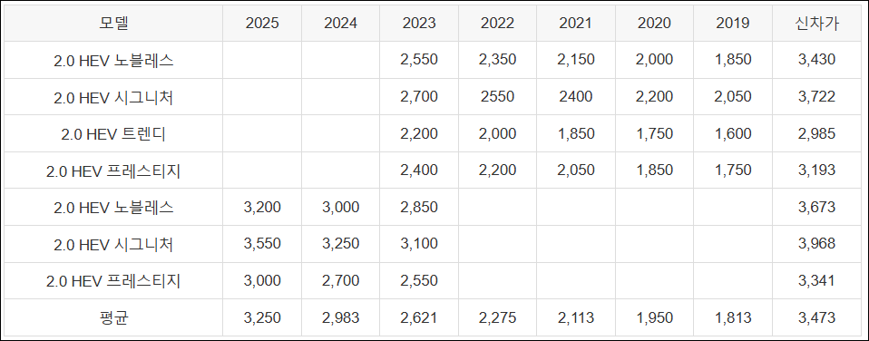 | 2.0 HEV 노블레스 | 2,550 | 2,350 | 2,150 | 2,000 | 1,850 | 3,430 | ||
