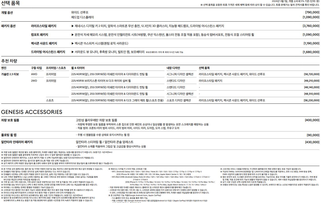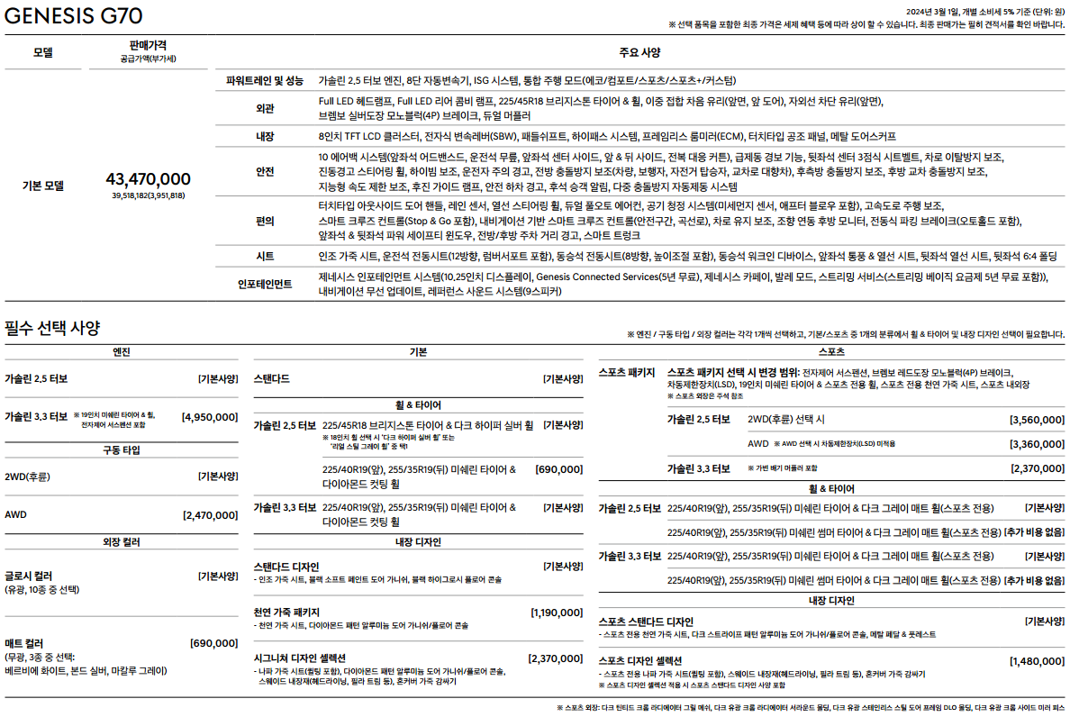 일반 G70의 가격은 4347만원입니다. 여기에 옵션을 추가하면 가격이 상승하게 됩니다. 옵션이 궁금하시다면 본문의 옵션표를 확인해보시기 바랍니다.