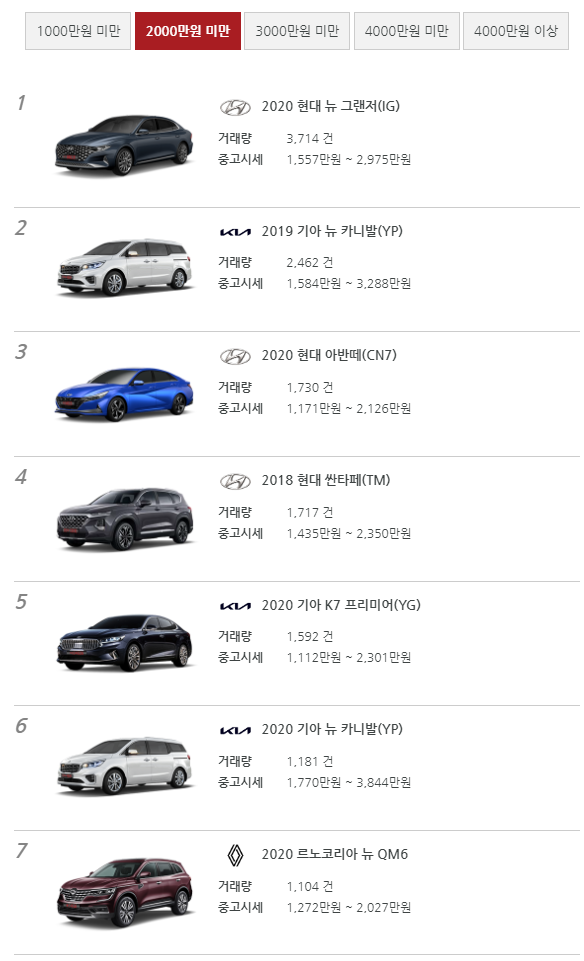2000만원 미만 중고차 순위는 2020년식 그랜저, 2019년식 카니발, 2020년식 아반떼 순서 입니다.