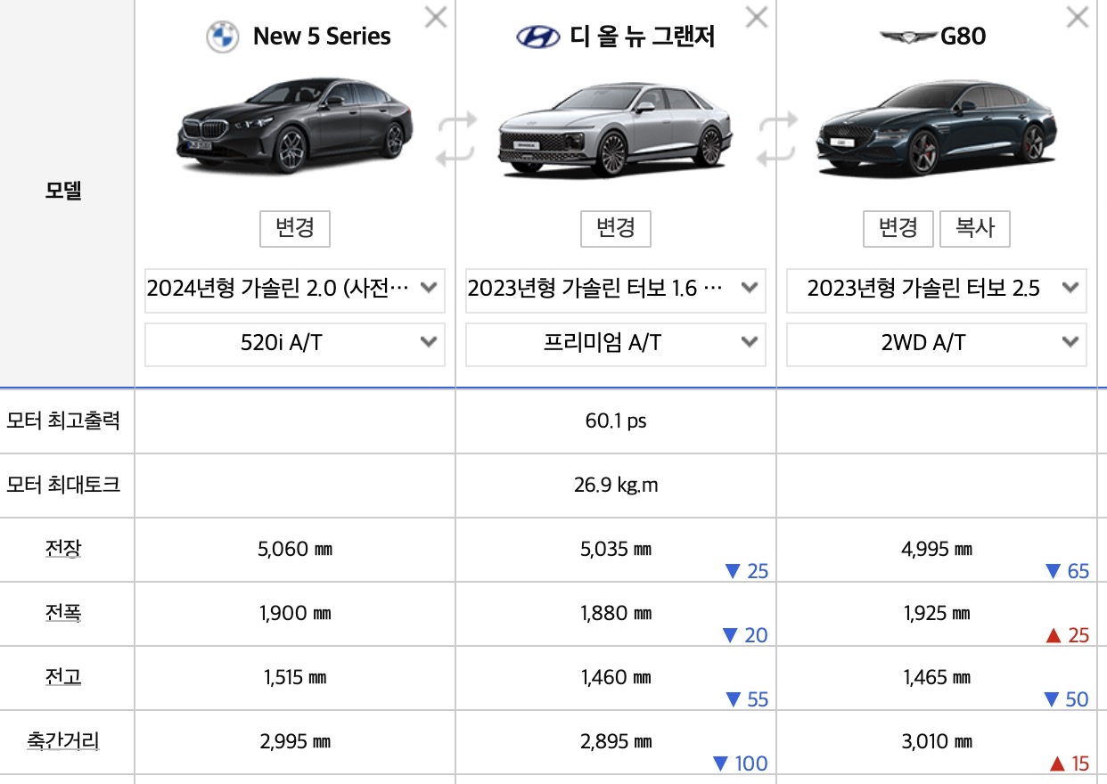g80과 비교해보자면 전장과 전고는 더 작지만, 전폭과 축간거리는 5시리즈가 더 넓은것을 볼 수 있습니다. 따라서 새로운 5시리즈의 크기는 그랜저와 G80의 크기와 비슷하다고 보면 되겠습니다.
