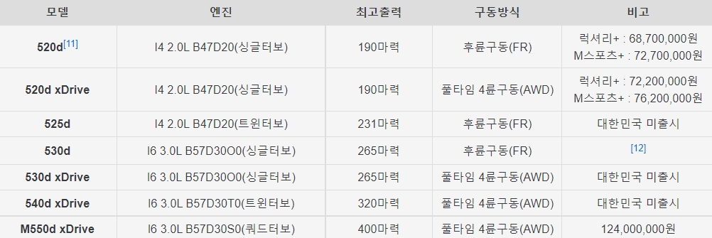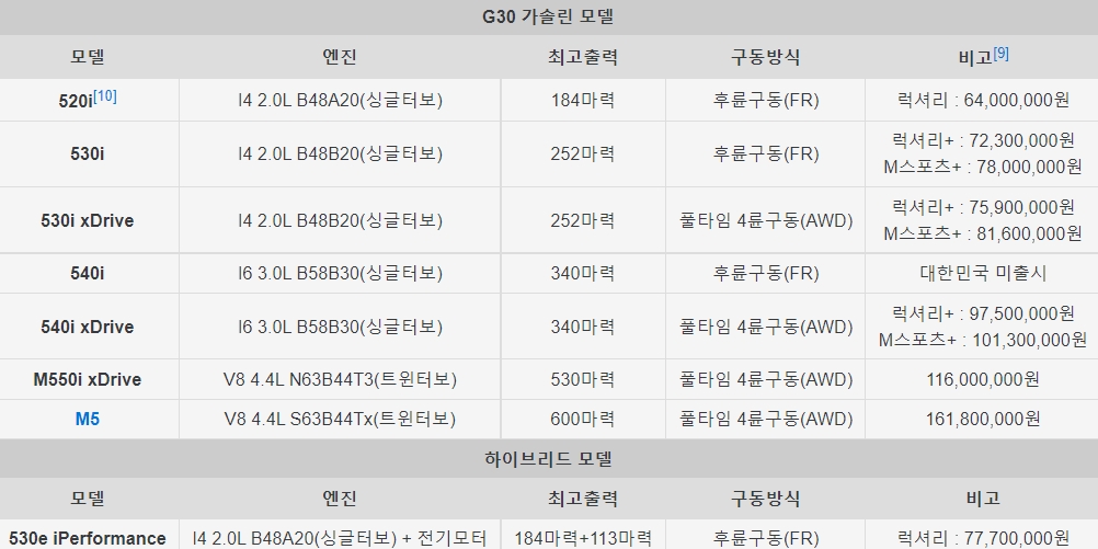 세부 라인업은 직렬 4기통 2.0L 가솔린 터보 엔진을 장착한 530i, 직렬 6기통 3.0L 가솔린 터보 엔진을 장착한 540i, 직렬 4기통 2.0L 커먼 레일 중고차 디젤 엔진을 장착한 520d를 처음 공개했습니다. 530i와 540i는 각각 528i와 535i를 교체했으며, 520d는 기존 LNT(배기가스 재순환)에서 SCR 방식으로 변경되어 연료 주입구 옆에 요소 물 주입구가 추가되었습니다. 또한 출시된 세 가지 엔진 라인업은 모두 X Drive를 선택할 수 있습니다. 2017년 2월 가솔린 2종과 디젤 2종이 처음 출시되었으며, 400마력 M550d가 2017년 11월에 출시되었으며, 540i도 2018년 1월에 출시되었습니다. 그 이후 플러그인 하이브리드 모델 530ei 성능 및 M 성능 모델 M550ixDrive가 추가될 예정입니다. M550i는 최고출력 462마력, 최대토크 66.3kg.m의 V84.4리터 가솔린 터보엔진을 장착해 4초간의 제로백을 자랑합니다.