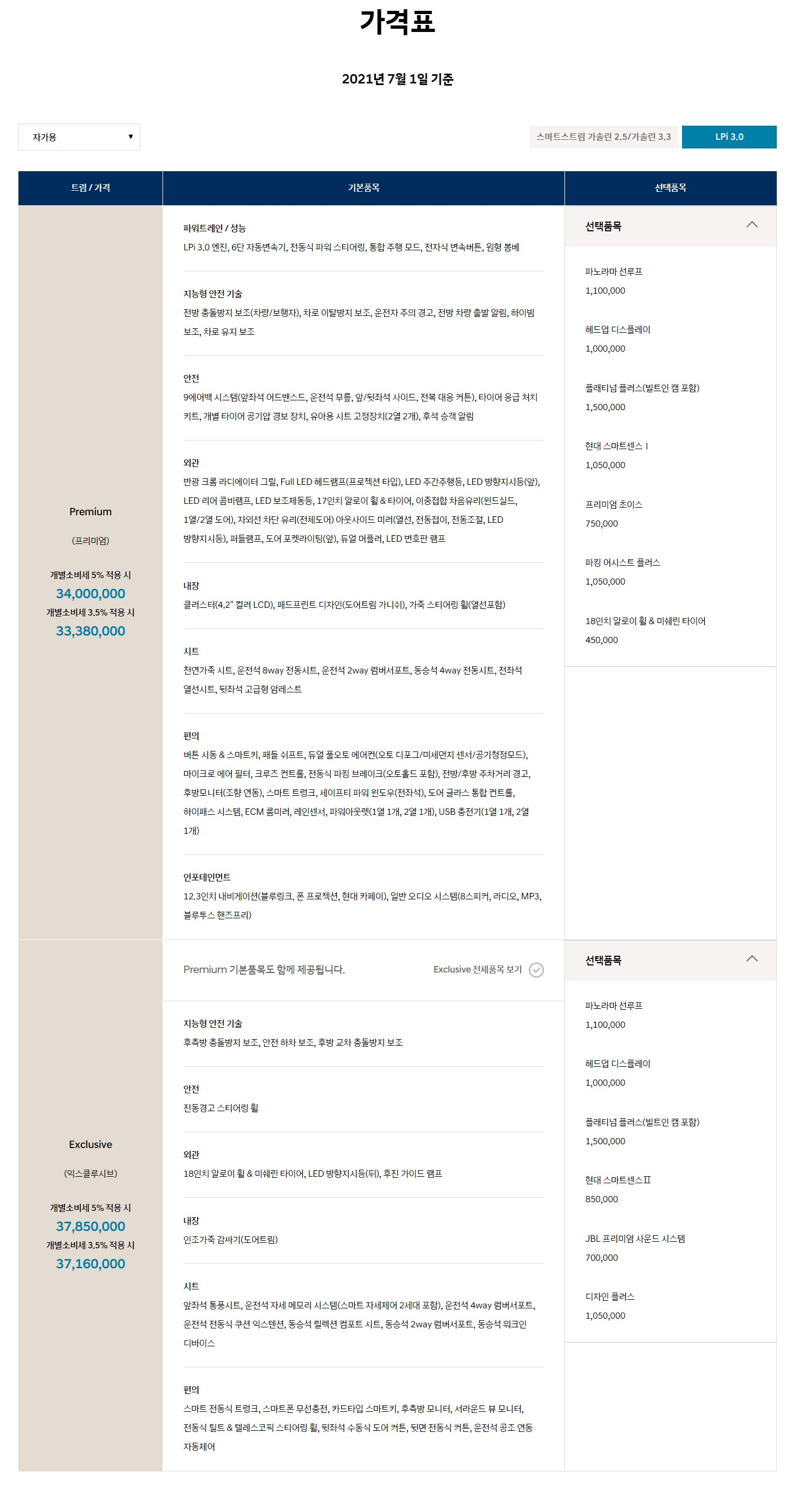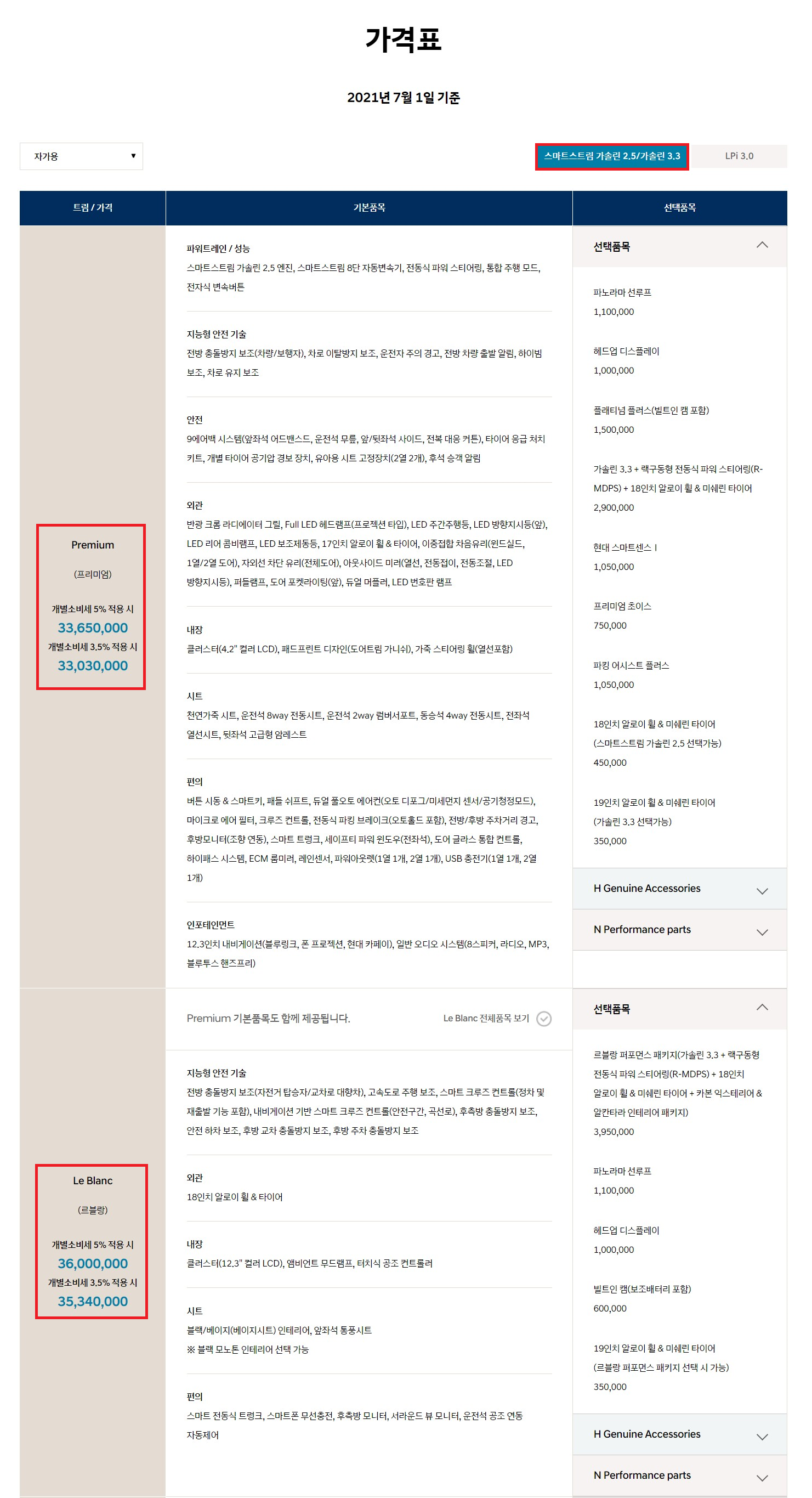 자동차 가솔린 스마트스트림 2.5/ 3.3 기준 가격표입니다.