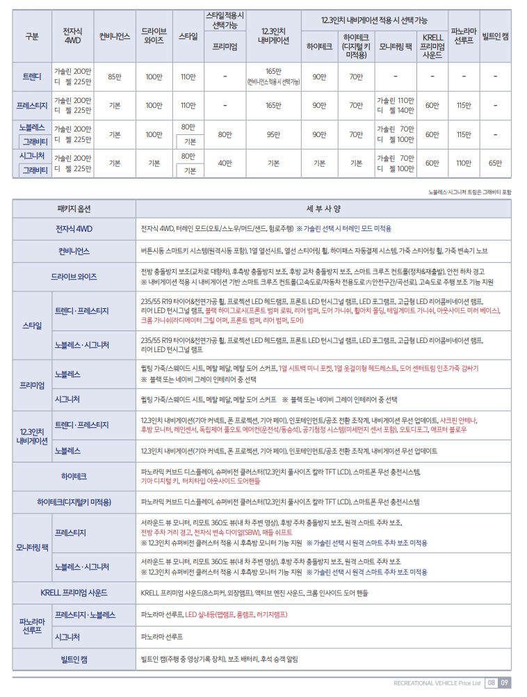 2011년 3월 1일부터는, 전사양에 1열 사이드&커튼 에어백이 기본 적용되어 최고 출력 261 마력에 최대 토크 37.2kg·m의 성능을 갖춘 2.0l 세타Ⅱ 가솔린 터보 GDI 엔진이 추가되었습니다. 그리고 2000년과 2001년에, 파리 다카르 랠리에 T3(완전 개조 부문)로서 출장해, 공식 완주에 성공했습니다. 1994년 8월에는 기아 엠블럼이 타원형으로 변경되었습니다. 처음에는 쇼트 바디 뿐이었지만, 1996년 1월 19일에는 그랜드라는 이름이 붙여진 롱 바디가 추가되었습니다. 벨트 라인과 변속 부분을 감싼 인디게이터 패널의 재질이 스테인리스로 변경되어 타이어 공기압 경보장치가 모든 트림에 기본 적용된 2015년형을 선보였습니다.