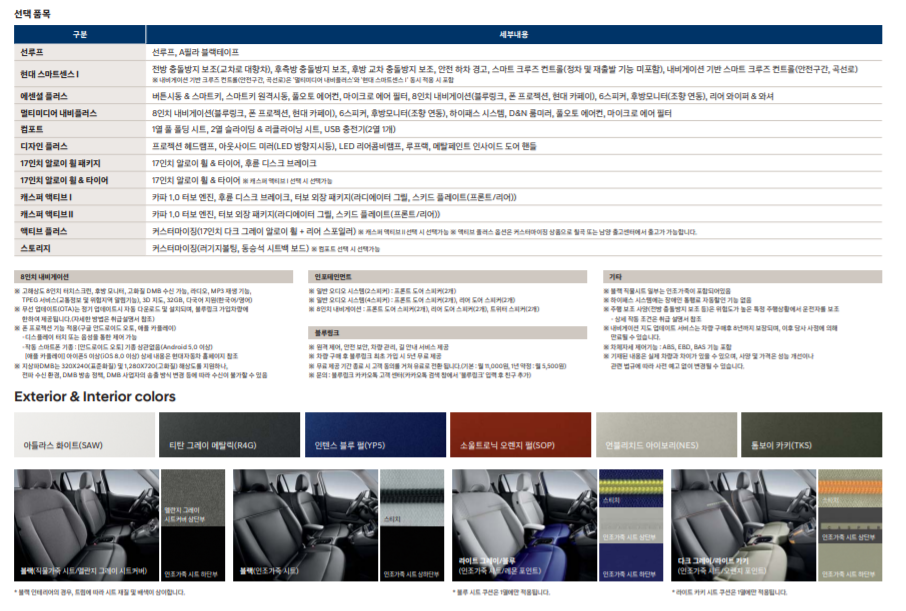 4인승으로 형식승인을 받았습니다. 뒷좌석 시트는 1인석 2장을 붙여 놓은 형태입니다. 카파 1.0리터 스마트 스트림 가솔린 엔진은 모닝 그레이에 장착되는 기존 76마력 에코 프라임 자연 흡기 엔진을 기본으로 100마력 터보 엔진을 옵션으로 제공합니다. 자동 변속기는 4단입니다.