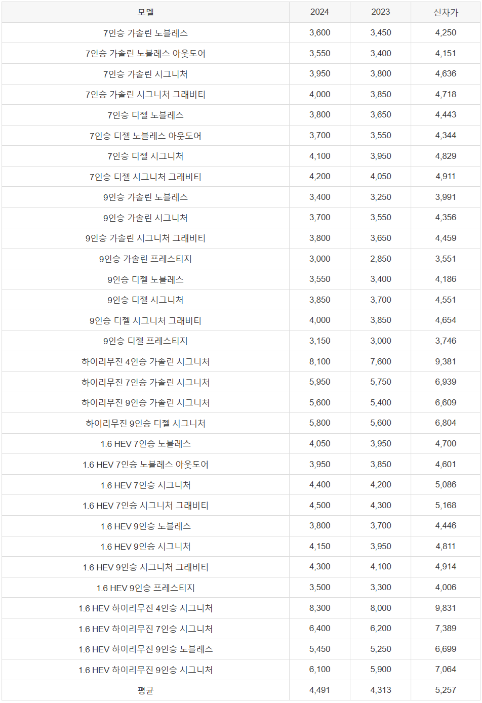 2023년부터 출시중인 카니발 4세대 중고차 가격은 평균 2024년식 4491만원, 2023년식 4313만원입니다.