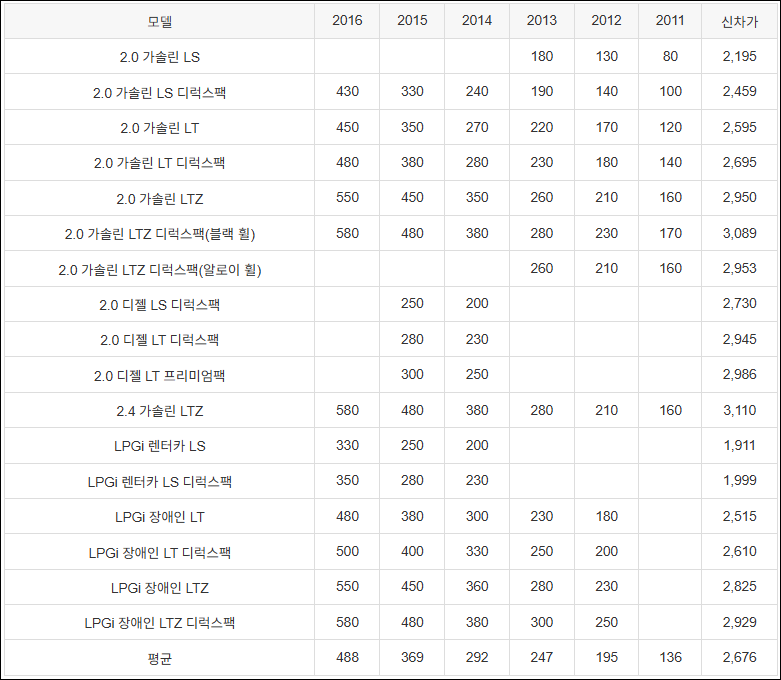| 2.4 가솔린 LTZ | 580 | 480 | 380 | 280 | 210 | 160 | 3,110 |