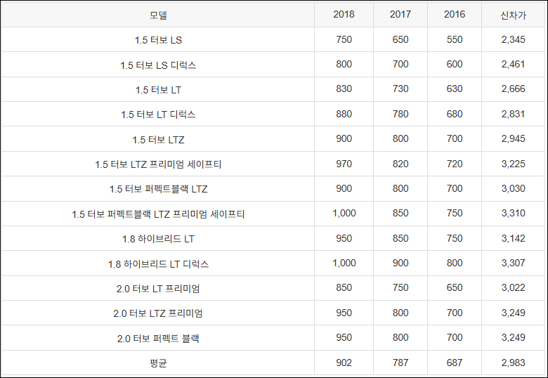 | 1.5 터보 LTZ | 900 | 800 | 700 | 2,945 |
