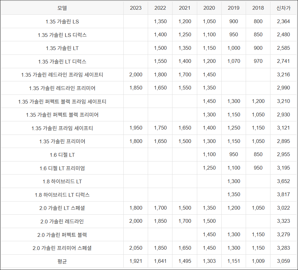 | 2.0 가솔린 LT 스페셜 | 1,800 | 1,700 | 1,500 | 1,350 | 1,200 | 1,050 | 3,022 |
