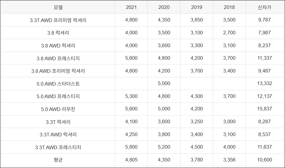| 3.3T AWD 럭셔리 | 4,250 | 3,800 | 3,400 | 3,100 | 8,537 |