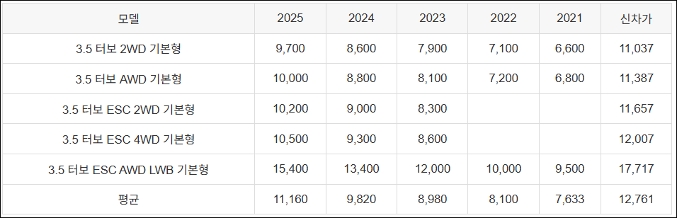 | 3.5 터보 AWD 기본형 | 10,000 | 8,800 | 8,100 | 7,200 | 6,800 | 11,387 |